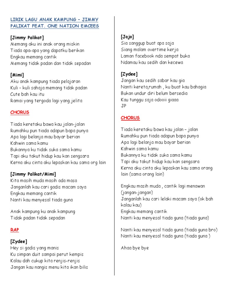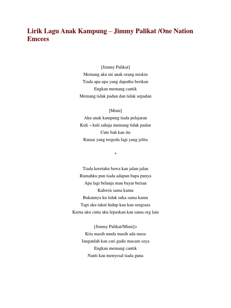 Tiada apa-apa yang dapatku berikan. Memang aku ini anak orang miskin Tiada apa-apa yang dapatku berikan Engkau memang cantik Memang tidak padan dan tidak sepadan Aku anak kampung tiada pelajaran Kuli kuli sahaja memang tidak padan Cute bah kau itu Ramai yang tergoda lagi yang jelita Tiada keretaku bawa kau jalan-jalan. Lirik Lagu Anak Kampung Jimmy Palikat ft One Nation Emcee Jimmy Palikat Memang aku ini anak orang miskin Tiada apa-apa yang dapatku berikan Engkau memang cantik Memang tidak padan dan tidak sepadan Mimi Aku anak kampung tiada pelajaran Kuli kuli sahaja memang tidak padan Cute bah kau itu Ramai yang tergoda lagi yang jelita.